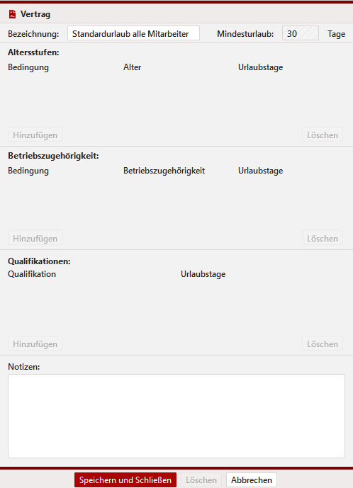 - Im ersten Bereich vergeben Sie dem Vertrag eine Bezeichnung und den so genannten Mindesturlaub, auf den die weiteren Bereiche aufbauen können.