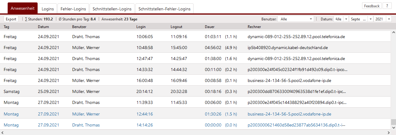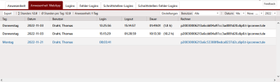Die erfassten Daten können über die Auswertungen ebenfalls herangezogen werden. Loggt sich ein Benutzer an verschiedenen Rechnern zur selben Zeit ein, wird die Anwesenheit nur einmalig gezählt. Die unterschiedlichen Logins erkennen Sie dann auf der Registerkarte Logins.