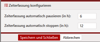 Über den Button können Sie für die Zeiterfassung über die WebApp zusätzliche Einstellungen vornehmen. Dabei können Sie festlegen, wann eine automatische Pause vorgesehen wird und wann ein automatischer Logout stattfinden soll.
