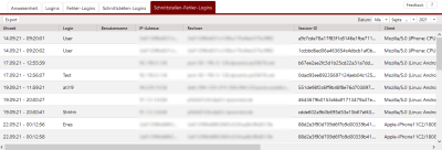 Auf der Registerkarte Logins werden die allgemeinen Log-Daten mitgeschrieben. Hier können Sie Startzeit, Login-Namen, die IP-Adresse, den Rechner, die genutzte Session-ID sowie den Client sehen. Die direkten Rechner-Daten werden Ihnen nur in den TecArt-Server-Versionen übermittelt, wenn diese zuvor in der Benutzeradministration festgelegt wurden. Die Login-Daten werden für 365 Tage aufgehoben und danach gelöscht. Dies gilt auch für die nachfolgenden Schnittstellen-Logins oder Fehlerhafte-Logins.