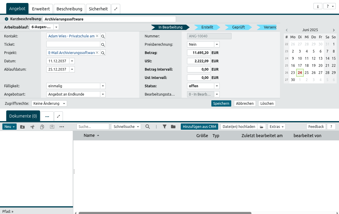 Bestätigen Sie Ihre Eingaben mit einem Klick auf . Sie haben weiterhin die Möglichkeit, zu Ihrem Angebot noch Dokumente hinzuzufügen. Wie das funktioniert, finden Sie unter Kopieren und Einfügen von Ordnern und Dokumenten.