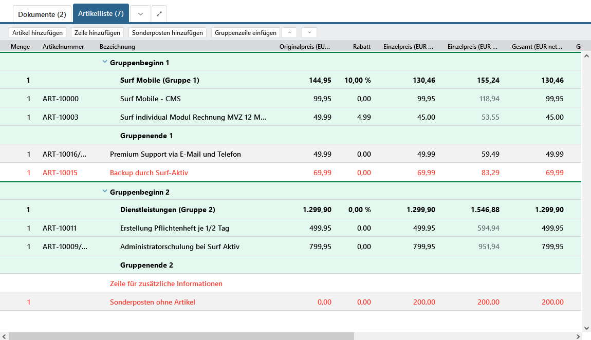 | Artikel eingefügt in Gruppe | Artikelbeschreibung, Menge, Einzel- und Gesamtpreise werden für diesen Artikel ausgegeben. Wählen Sie nicht für alle Artikel diese Optionen aus, kann es vorkommen, dass die ausgegebenen Einzelpreise am Ende nicht die Summe der Gruppenzeile ergeben. | ||