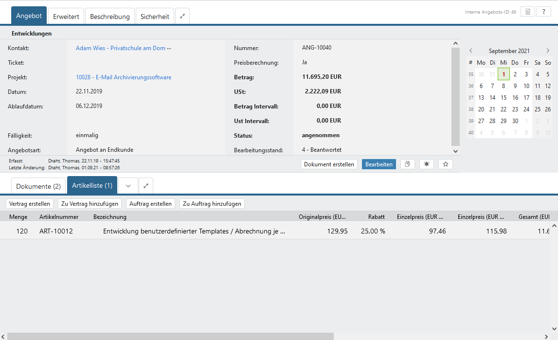 Wenn Sie auf den Button bzw. klicken, öffnet sich ein neuer Vertrag bzw. Auftrag. Dieser übernimmt automatisch die Angaben aus dem Angebot, wie bspw. Kontakt, Projekt, Preisberechnung und die markierten Artikel.