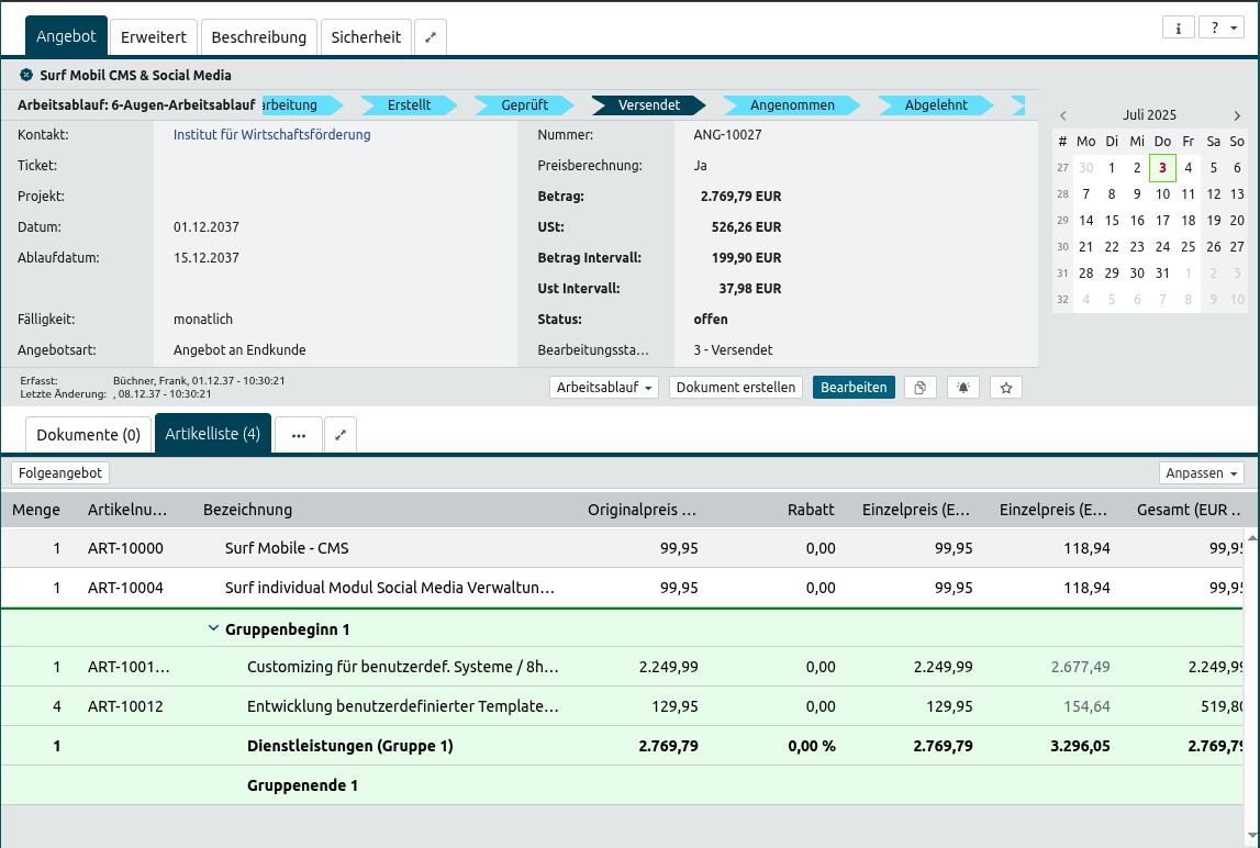 Um ein bereits bestehendes Angebot zu bearbeiten, öffnen Sie das Objekt durch einen Doppelklick und betätigen den Button . Das Angebot wechselt daraufhin in den Bearbeitungsmodus, in dem Sie die gewünschten Änderungen vornehmen können.