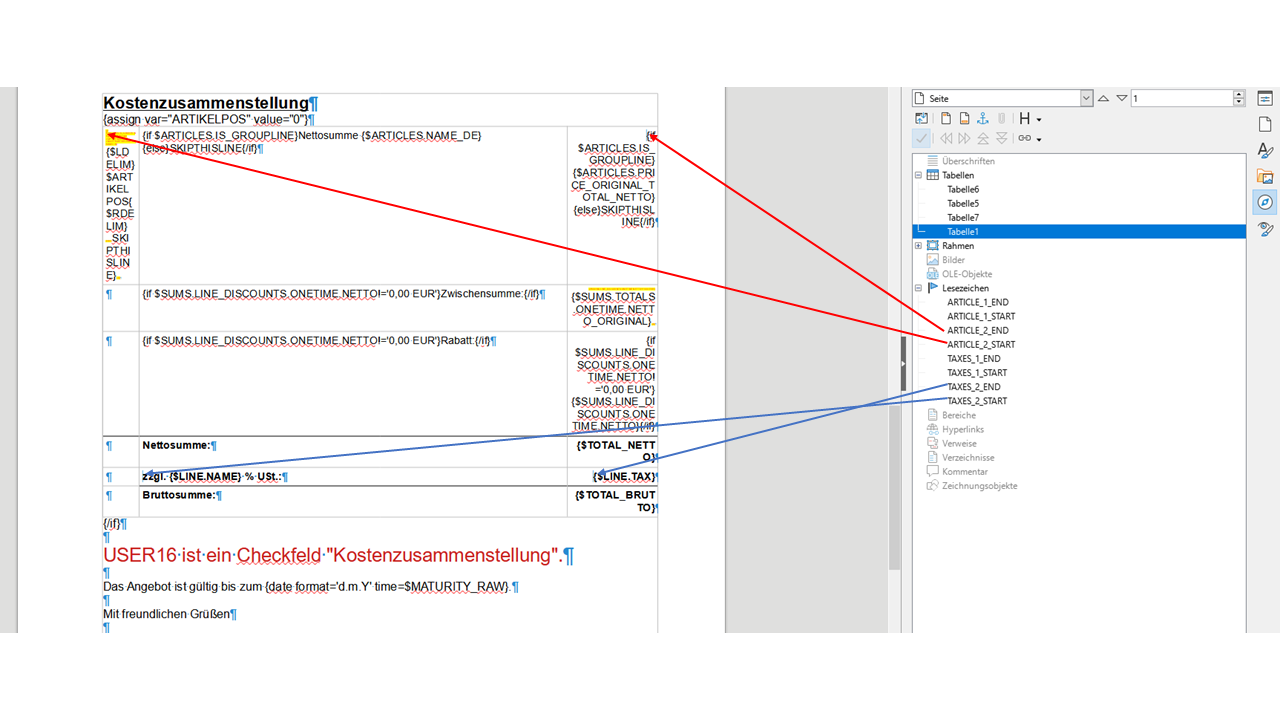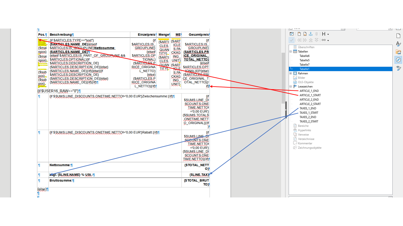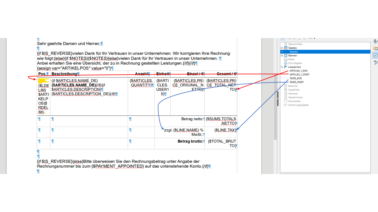 Textmarken stellen bei der Erstellung des Dokumentes Schleifen dar, welche gesucht werden und so oft durchlaufen werden, bis alle auszugebenden Werte im Dokument eingefügt wurden. Beispielsweise können Sie bei den Artikeln nicht im Vorfeld wissen, ob Sie in der Vorlage 5 Zeilen oder 50 Zeilen mit Artikeln benötigen. Gibt es für Artikel eine Textmarke, die anhand Ihrer Anzahl der ausgewählten Artikel durchläuft, werden dabei immer alle Inhalte kopiert, die sich zwischen den Textmarken befindet.