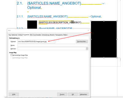 | Artikel | crm://docs/B/images/Bild.png | crm://docs/B1234/images/Bild.png – Gibt das Bild aus dem jeweiligen Artikel wieder. Da die Artikel meistens innerhalb von Schleifen in Angeboten, Aufträgen, Ausgangsrechnungen, Lieferscheinen und Gutschriften verwendet werden, muss hier ein Verweis auf das Modul Artikelverwaltung erfolgen. Weiterhin wird in den Artikeln ein Bildpfad automatisch erzeugt. |