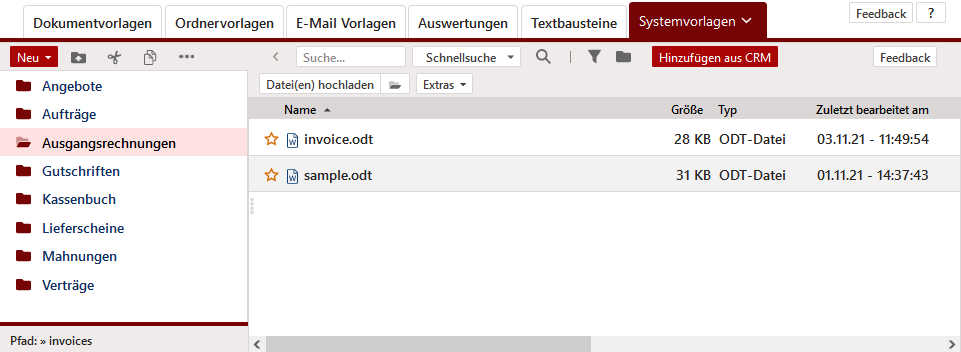 Erstellen Sie weitere ODT-Systemvorlagen mit beliebigen Namen und fügen Sie diese ebenfalls in die entsprechenden Ordner mit den Modulbezeichnungen auf der Registerkarte Systemvorlagen ein.