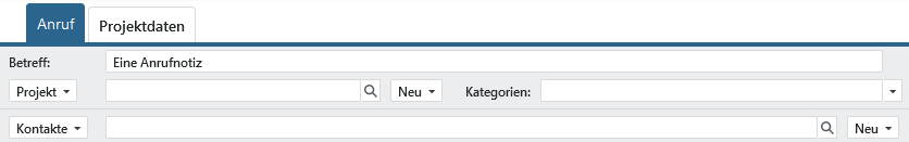 Im oberen Bereich befindet sich das Feld Betreff. Bei diesem handelt es sich um ein Pflichtfeld, d.h. Sie müssen einen Betreff vergeben, um die Anrufnotiz speichern zu können. Bei automatisiert angelegten Anrufen über die Telefonanlage wird als Betreff standardmäßig Neuer ausgehender Anruf oder Neuer eingehender Anruf zugewiesen. Solange Sie entsprechende Zugriffsrechte besitzen, können Sie den Betreff und die anderen Angaben jederzeit ändern. Weiterhin können Sie ein Projekt, Angebot, Vertrag, Ticket oder Auftrag verknüpfen, wie auch Kategorien festlegen und Kontakte oder Leads eintragen.