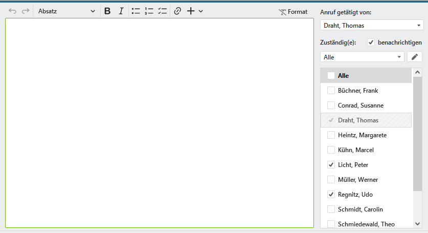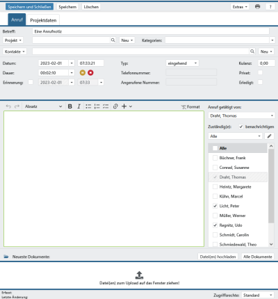 Änderungen an den Anrufnotizen können Sie jederzeit nach dem Öffnen durchführen, sofern Sie für diesen Anruf zuständig sind oder diesen erzeugt haben. Es ist jedoch ratsam, bei einem Rückruf einen neuen Anruf zu erzeugen, da sonst ein Teil der Notizen wie Datum und Uhrzeit verändert werden könnten oder überschrieben werden. Öffnen zwei oder mehrere Personen gleichzeitig eine Anrufnotiz, so erhält nur die erste Person die Schreibrechte. Alle anderen Personen sehen den Namen des aktuellen Bearbeiters mit Schreibrecht eingeblendet und können über direkt den internen Chat nutzen.