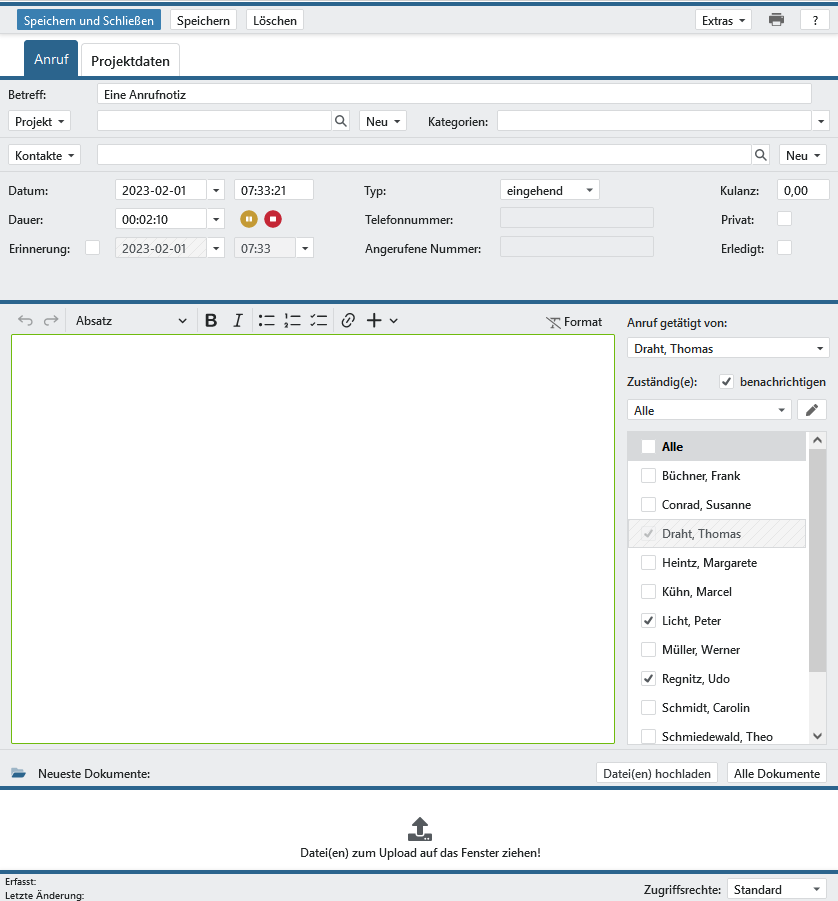 Kategorien gliedern die Anrufe optional. Der zweite Bereich definiert das Datum mit Uhrzeit, die Länge eines Anrufs und den Typ. Machen Sie hier auch Angaben zur Erinnerung oder markieren Sie diesen direkt als erledigt. Daneben können Sie den Anruf auch als privat kennzeichnen. Im unteren Bereich können Sie nähere Angaben zum Anruf eintragen sowie die Zuständigkeit Ihrer Kollegen inklusive möglicher Benachrichtigungen regeln. Hier ist Ihr Benutzer standardmäßig vordefiniert. Als Letztes können Sie noch Dokumente hochladen bzw. zum Anruf verknüpfen.