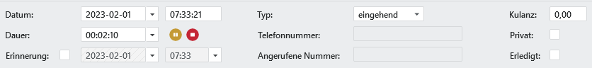 Im mittleren Bereich des Anruffensters machen Sie Angaben zu Datum und Uhrzeit. Dabei werden jeweils das aktuelle Datum und die Systemzeit vorgetragen. Über den Typ können Sie zwischen eingehenden und ausgehenden Gesprächen wählen. Beim Anlegen einer neuen Anrufnotiz startet automatisch ein Timer um die Dauer des Gespräches zu erfassen. Wenn eine Anrufnotiz durch einen eingehenden Anruf automatisch geöffnet wird, startet der Timer nicht automatisch. Sollte bereits ein Timer aus einer anderen Zeiterfassung laufen, erhalten Sie die Meldung, dass Sie nur einen Timer im System laufen lassen können. Der Timer kann jederzeit angehalten, fortgesetzt bzw. gestoppt werden.
