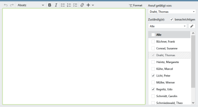 Mit dem Kontrollkästchen Erledigt verändern Sie den Status des Anrufs. Durch die Aktivierung der Option Privat wird der Anruf als privat markiert. Dies hat zur Folge, dass nur die in der rechten Liste ausgewählten Personen Informationen zu diesem Anruf abrufen können. Nicht markierte Personen haben keinen Zugriff auf den Anruf und folglich erscheint dieser auch nicht in der Anrufliste.