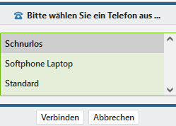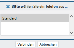 Bei Aktivierung der Option Direkt wählen, wenn nur ein Telefon verfügbar wird bei Einrichtung eines einzigen CTI-Clients das Fenster zur Auswahl der CTI-Clients übersprungen. Existiert also nur ein einziges eingerichtetes Telefon, erscheint das unten angezeigte Fenster nicht. Sobald mehr als ein eingerichtetes Telefon existiert oder die Option ausgeschaltet ist, wird das Fenster angezeigt und die Verbindung erst aufgebaut sobald man das gewünschte Telefon ausgewählt hat.