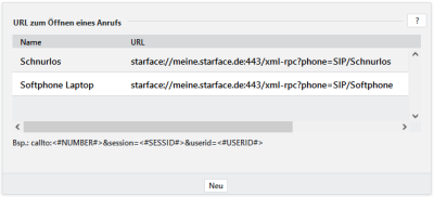 | URL | In diesem Feld wird die URL für die Telefonanlage eingetragen. Je nach Typ können verschiedene Parameter übergeben werden, um entsprechende Daten zwischen der Telefonanlage und dem TecArt CRM auszutauschen. |