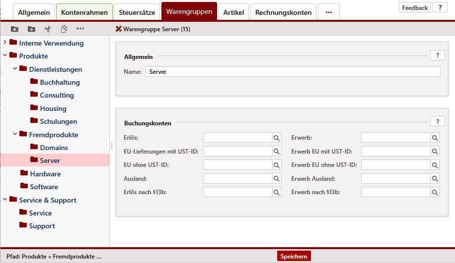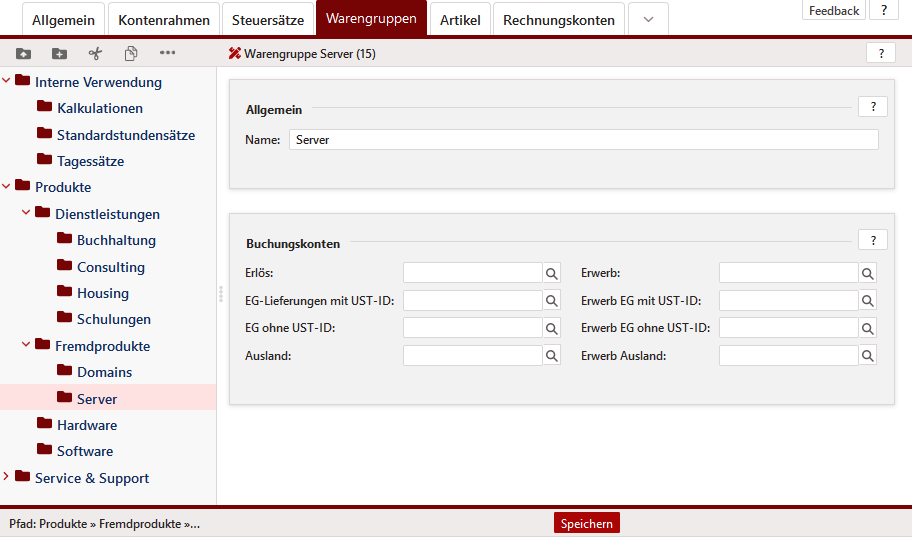 Zur Umbenennung einer Warengruppe markieren Sie diese zunächst und verändern auf der rechten Seite den Namen der Warengruppe.