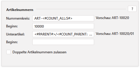 | Unterartikel | Für untergeordnete Artikel können Sie einen abweichenden Nummernkreis definieren als bei neuen Artikeln. Auch ist eine Kombination aus beiden Nummernkreisen möglich. Hinweise zu den verschiedenen Variablen und Kombinationen finden Sie unten. |