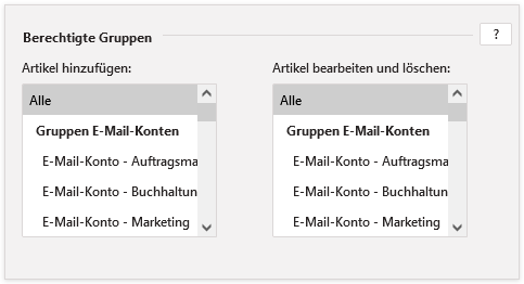 Die Auswahl der Mitarbeiter, welche neue Artikel anlegen dürfen, legen Sie im Feld Artikel hinzufügen in Form einer Gruppenauswahl fest. Mehrere Gruppen können Sie mit gedrückter Strg-Taste aus- bzw. abwählen. Für Mitarbeiter, welche berechtigt sind bestehende Artikel zu bearbeiten oder zu löschen, nehmen Sie ebenfalls eine Gruppenauswahl im Feld Artikel bearbeiten und löschen vor.