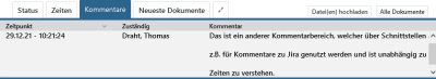 Zeige Kommentare im Aufgabenfenster Das ist ein anderer Kommentarbereich, welcher über Schnittstellen angesprochen werden kann. Dieser kann z.B. für Kommentare zu Jira genutzt werden und ist unabhängig zu den Kommentaren im Bereich der erfassten Zeiten zu verstehen.