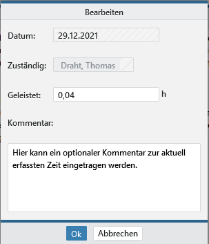Zeiten verpflichtend beim Speichern eintragen Wird diese Option gesetzt, wird für die erfasste Zeitdifferenz, welche zwischen der bereits erfassten Zeit zum Start der Aufgabe im Feld Geleistet und der aktuell dort eingetragenen Zeit eine verpflichtende Eintragung mit Klick auf geöffnet. Sollte keine Zeitdifferenz aufgelaufen sein, wird das Fenster dennoch geöffnet und man hat die Möglichkeit direkt eine geleitete Zeit nachzutragen. Optional kann ein Kommentar für die geleistete Zeit eingetragen werden.