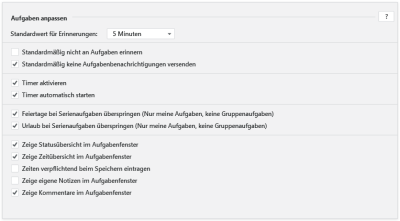 Über diese Optionen können Sie Grundeinstellungen für Ihre Aufgaben und Aufgabenübersicht vornehmen. Hierbei legen Sie fest, wie bestimmte Merkmale in den Aufgaben verwendet werden sollen. Das betrifft sowohl Benachrichtigungen, Erinnerungen oder auch weiterführende Bedienelemente, wie die automatische Zeiterfassung mit dem Timer bzw. private Notizen.