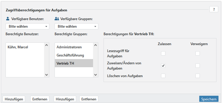 Über die Zugriffsberechtigungen können Sie die generellen Einstellungen für das Lesen und Erstellen Ihrer Aufgaben regeln. Auf dieser Registerkarte können Sie für jeden Benutzer individuelle Einstellungen vornehmen. Neben den generellen Lese- und Schreibrechten werden hier auch eventuelle Löschrechte individuell vergeben.