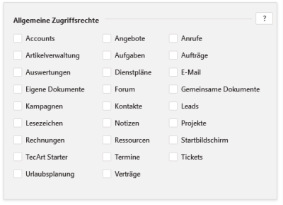 - Spezielle Zugriffsrechte, welche bestimmte Module erweitern oder einschränken. Hierzu zählen u.a. die Erstellung neuer Kontakte oder Projekte