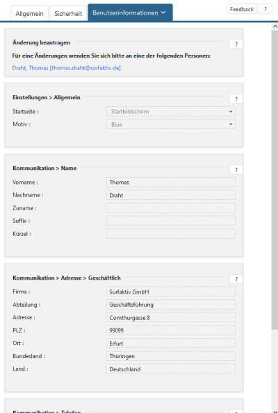 Auf der Registerkarte Sichtbarkeit geht es in erster Linie um die Veröffentlichung von Informationen Ihrer Benutzer. Anhand der DSGVO haben Ihre Mitarbeiter das Recht die über sie gespeicherten und eingestellten Informationen einzusehen und dies auch dann, wenn Sie keine administrativen Rechte besitzen. Alle über ihn gespeicherten und freigegebenen Informationen kann ein Benutzer unter > > Benutzerinformationen einsehen.