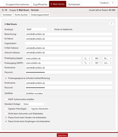 Haben Sie ein Gruppen-E-Mail-Konto eingerichtet, erhalten alle Mitarbeiter, die der Gruppe zugeordnet werden, Zugriff auf dieses Konto. Beachten Sie ggf. noch weitere notwendige Einstellungen, dann jedoch für jeden Benutzer dieses Kontos gesondert, auf der Registerkarte E-Mail-Konto in den Bereichen Ordnerauswahl, Standard-E-Mail-Konto oder E-Mail-Optionen. Auch für das Signieren und Verschlüsseln von E-Mails, stehen Ihnen zentrale Einstellungen zur Verfügung.