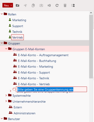 Wählen Sie in der Baumstruktur den Ordner Gruppen, einen Unterordner oder eine bereits vorhandene Gruppe aus, so dass der Ordner oder die Gruppe farblich markiert ist. Klicken Sie auf und dann auf . In dem vorgesehenen Feld tragen Sie einen Namen für diese Gruppe ein. Die neue Gruppe wird in Ihrer Gruppenstruktur eingefügt. Markieren Sie die neu angelegte Gruppe durch Klicken, um danach die individuellen Einstellungen der Gruppe vorzunehmen.