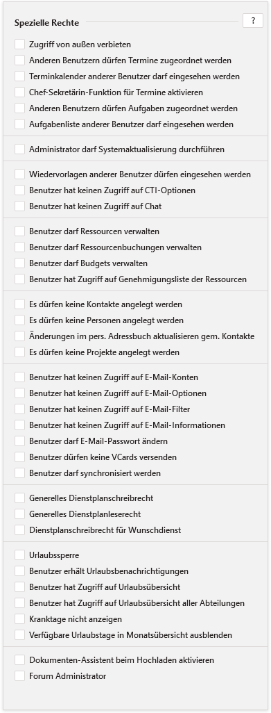 | Terminkalender anderer Benutzer darf eingesehen werden | Diese Benutzer dürfen alle Terminkalender der anderen Benutzer einsehen. Auch eine Sperrung der Terminkalenderansicht über die persönlichen Einstellungen ist nicht möglich. Dieses Recht ist als globales Recht zu verstehen und überschreibt automatisch individuelle Einstellungen. |
