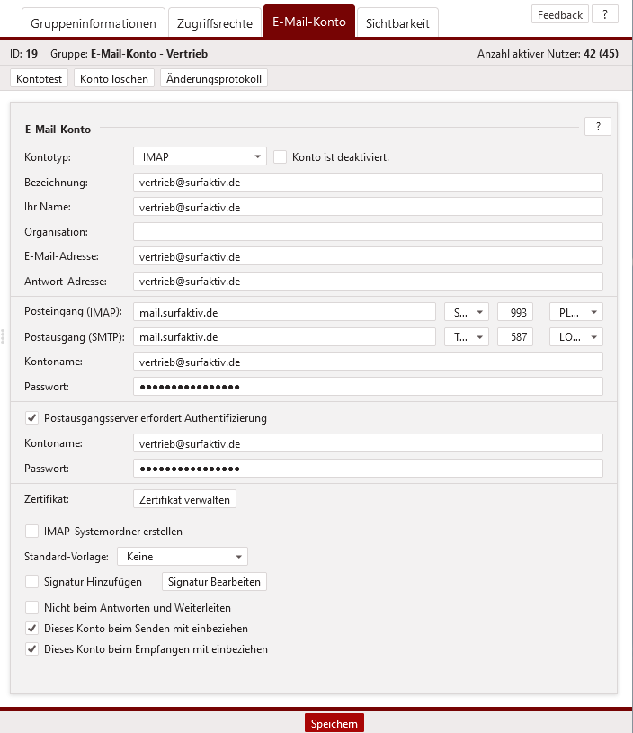 Haben Sie ein Gruppen-E-Mail-Konto eingerichtet, erhalten alle Mitarbeiter, die der Gruppe zugeordnet werden, Zugriff auf dieses Konto. Beachten Sie ggf. noch weitere notwendige Einstellungen, dann jedoch für jeden Benutzer dieses Kontos gesondert, auf der Registerkarte E-Mail-Konto in den Bereichen Ordnerauswahl, Standard-E-Mail-Konto oder E-Mail-Optionen. Auch für das Signieren und Verschlüsseln von E-Mails, stehen Ihnen zentrale Einstellungen zur Verfügung.