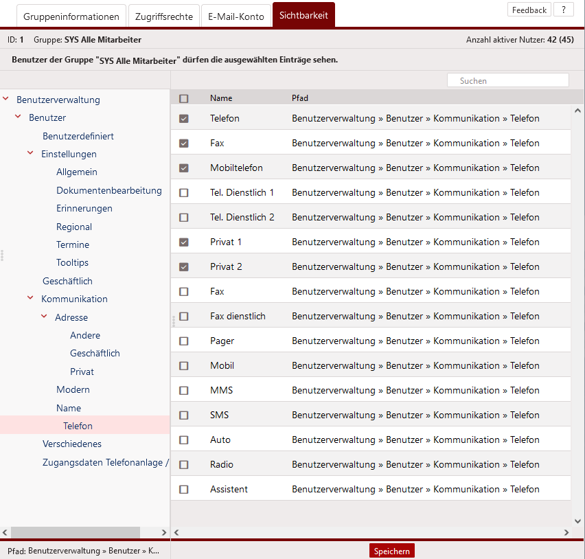 Damit die Informationen einem Benutzer freigegeben werden, markieren Sie zunächst einen Eintrag in der linken Spalte. Rechts werden Ihnen die zugehörigen Daten angezeigt, welche Sie dann mit der Checkbox aktivieren/deaktivieren können. Bitte drücken Sie auf jeder einzelnen Seite auf , bevor Sie einen weiteren Eintrag auf der linken Seite auswählen. Alle aktivierten Einträge sieht der Benutzer dann, ohne direkt selbst Änderungen vornehmen zu können.