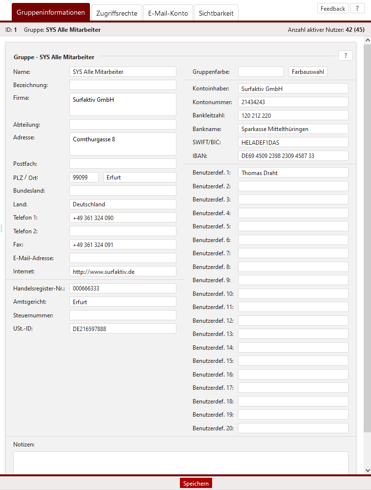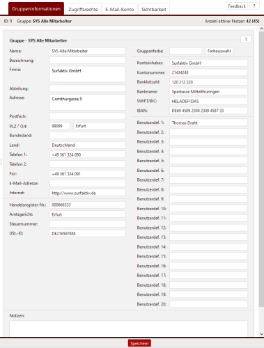 Unter den Gruppeninformationen können Sie Daten administrieren. Zu diesen zählen allgemeine Daten für die Verwendungen in den Dokumentenvorlagen und E-Mail-Vorlagen. Weitere Bedeutung haben die hier einfügbaren Informationen nicht und können bei Nichtverwendung auch weggelassen werden. Füllen Sie nur die notwendigen Daten aus, um sich so administrativen Aufwand zu sparen.