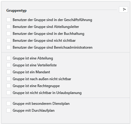 Gruppentypen spezifizieren Gruppen genauer. Diese Spezifikationen sind nur für bestimmte Gruppen notwendig und lösen darüber hinaus weitere Funktionen aus.