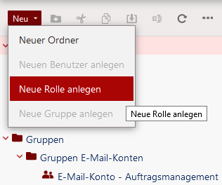 Wählen Sie in der Baumstruktur den Ordner Rollen oder einen Unterordner und markieren Sie diesen. Klicken Sie auf > . Tragen Sie in der vorgesehenen Zeile den Namen Ihrer Rolle ein. Die neue Rolle wird in Ihrer Rollenstruktur eingefügt.