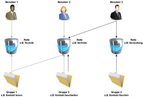 Dabei empfehlen wir Ihnen hauptsächlich die Rechtevergabe über Rollen und Gruppen zu organisieren. Die Rechtevergabe über Benutzer wird spätestens bei einem Wechsel der Zuständigkeiten zu massiven administrativen Aufwendungen führen. Dies können Sie vermeiden, sofern Sie die meisten Berechtigungen über Gruppen organisieren.