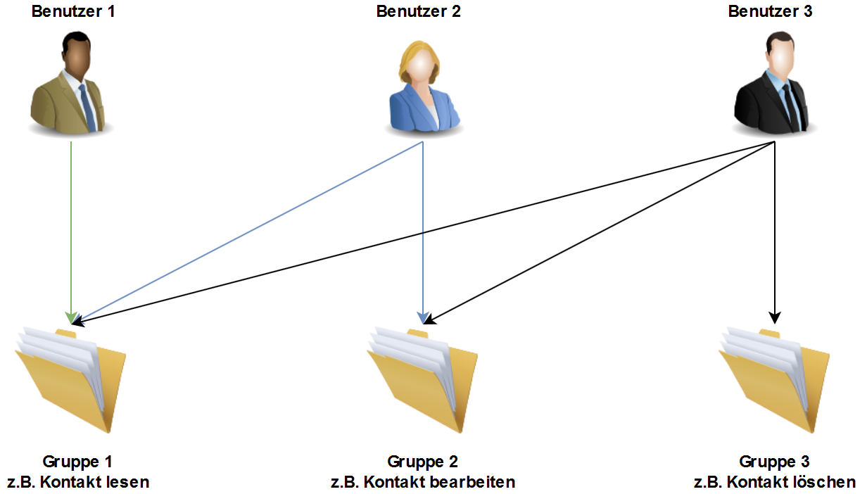 Dabei empfehlen wir Ihnen hauptsächlich die Rechtevergabe über Rollen und Gruppen zu organisieren. Die Rechtevergabe über Benutzer wird spätestens bei einem Wechsel der Zuständigkeiten zu massiven administrativen Aufwendungen führen. Dies können Sie vermeiden, sofern Sie die meisten Berechtigungen über Gruppen organisieren.