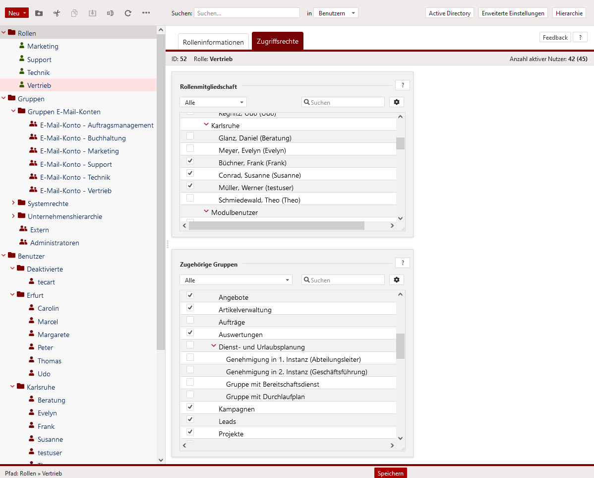 In der Praxis werden die Rechte vermutlich über ein Mischkonzept aus Rollen und Gruppen definiert. Einer möglichen Rolle Vertrieb gehören die Mitarbeiter und auch der Abteilungsleiter an. Die Abteilungsleiter können darüber hinaus auch einer weiteren Rolle Abteilungsleiter angehören. Ob darüber hinaus weitere Rechte spezieller gesetzt werden und Sie dafür weitere Rollen oder nur Gruppen definieren, liegt an der Komplexität Ihres Rechtemanagements.
