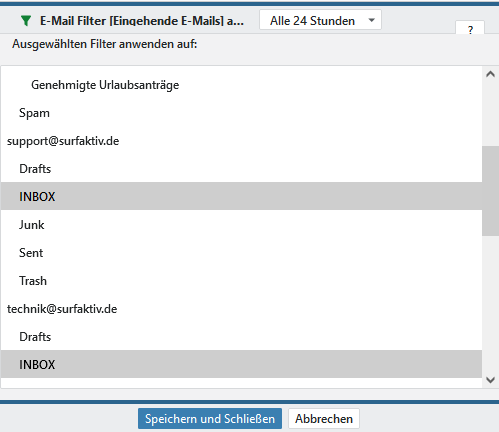 Wählen Sie eine Zeitspanne aus, um den Filter regelmäßig in dieser Zeit auszuführen und markieren Sie die gewünschten Ordner für die der Filter automatisch ausgeführt werden soll. Mehrere Ordner können Sie mit gedrückter Strg-Taste auswählen.