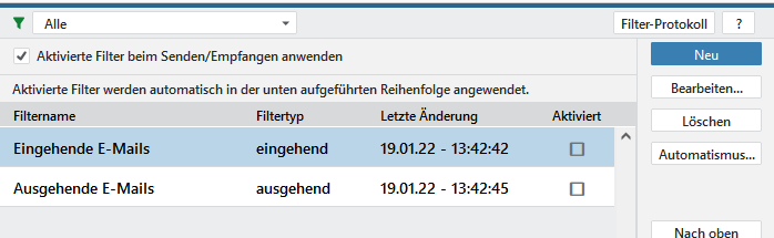 Markieren Sie durch einen Klick den entsprechenden Filter. Diese sollten vorzugsweise deaktiviert sein, da aktive Filter beim Eintreffen neuer Nachrichten automatisch ausgeführt werden.
