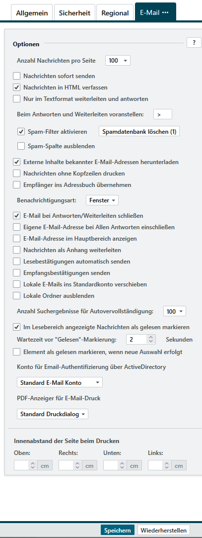 | Innenabstand der Seiten beim Drucken | Geben Sie über die vier Felder den gewünschten Abstand der Druckvorschau in cm je Rand an. Andernfalls werden die Daten der E-Mail ggf. auch randlos gedruckt. |