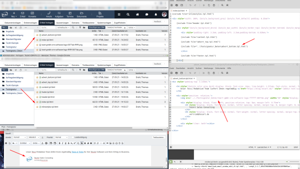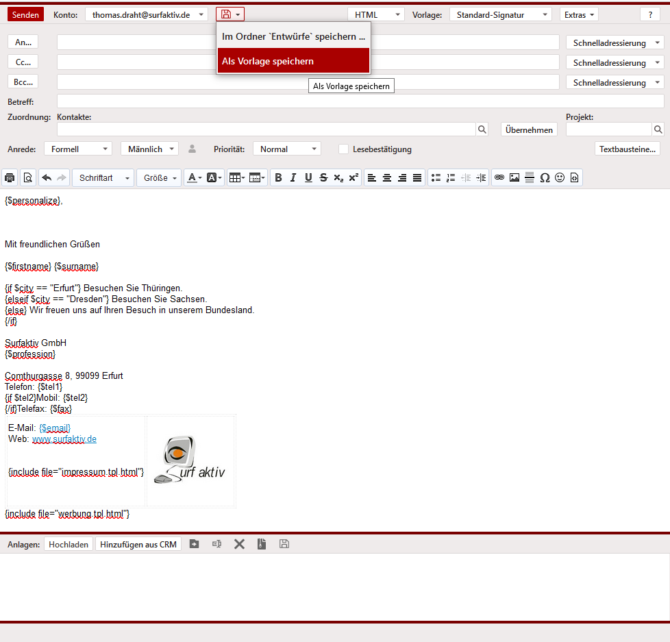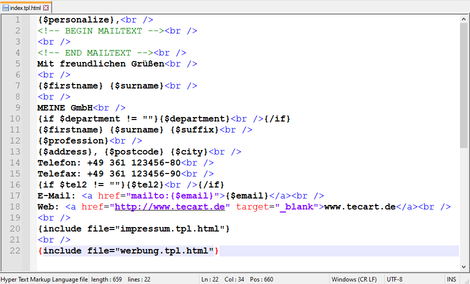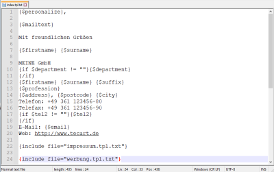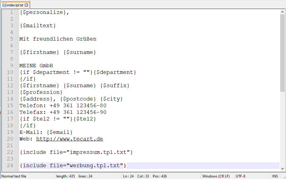- Impressum, wie Geschäftsführung, Inhaber, Handelsregister, Gericht, Steuer-ID, Kontonummer etc., benötigen Sie in jeder Vorlage. Ändert sich nur eine Angabe, genügt die Änderung in der Fragment-Datei und die Angabe ist in allen E-Mail-Vorlagen geändert.