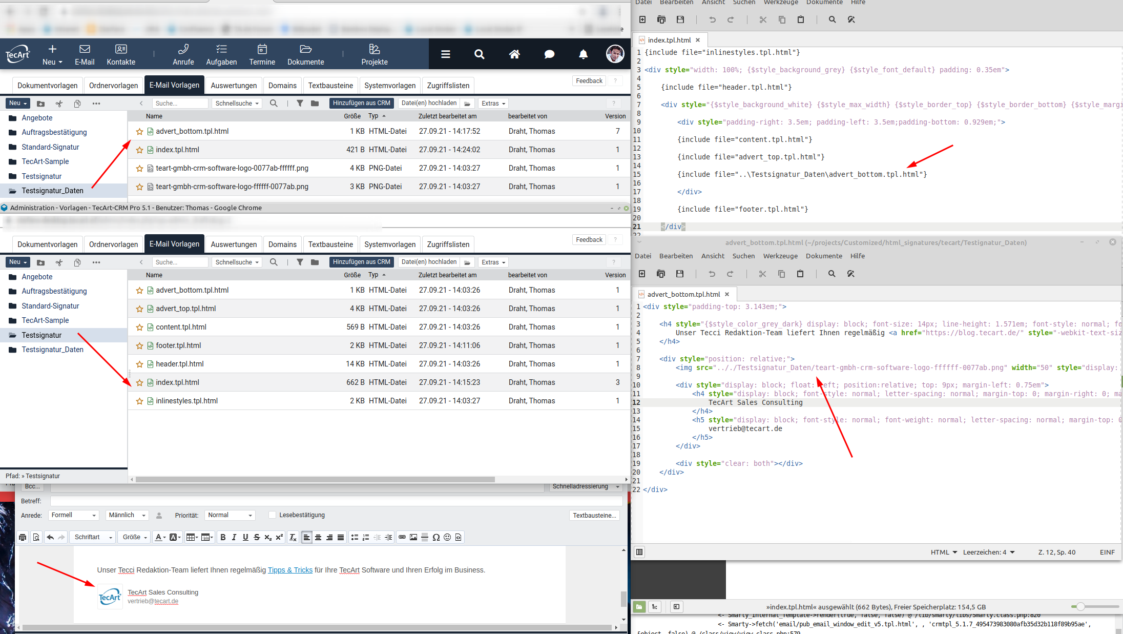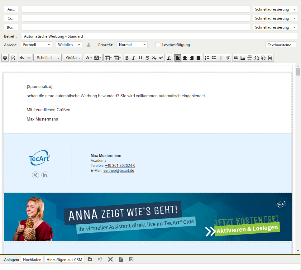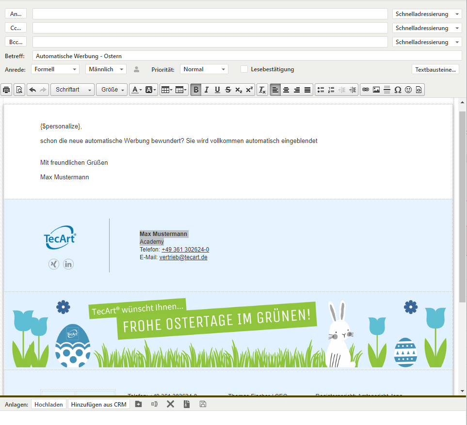 In vielen Systemen ist es so, dass jeder Mitarbeiter die eigene Signatur einstellen muss. Dabei werden Vorgaben gemacht und die Mitarbeiter in ihrem E-Mail-Programm aufgefordert die Signatur zu ändern. Im TecArt CRM ist dies anders. Hier können Sie eine E-Mail-Signatur für alle Mitarbeiter anlegen. Bei einer Änderung wird diese eine Vorlage geändert und automatisch haben alle Mitarbeiter mit der nächsten neuen E-Mail eine geänderte Signatur.