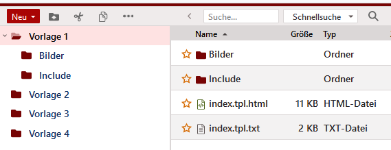 Erstellen Sie einen neuen Ordner default. Dieser beinhaltet alle Grafiken und Inhalte, welche über alle Vorlagen hinweg gleich sind. Die Template-Dateien erhalten die Namen default.tpl.html bzw. default.tpl.txt. Die Namensgebung ist Willkürlich und kann durch ihre eigenen Namen ersetzt werden.