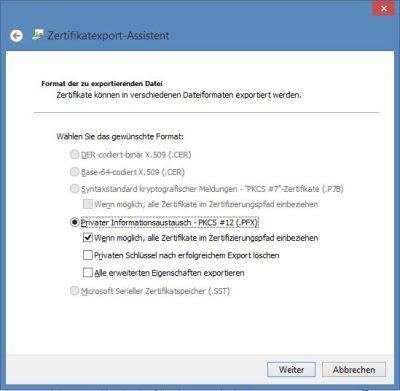 Folgen Sie dem Assistent für den Export des Zertifikats. Bitte achten Sie darauf, auch den privaten Schlüssel zu extrahieren, er ist für die Verschlüsselung von E-Mails notwendig.