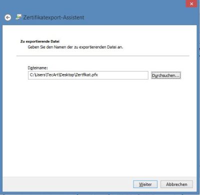 Im letzten Schritt können Sie das Zertifikat lokal abspeichern, somit steht einem Import in Ihr TecArt CRM nichts mehr im Wege.