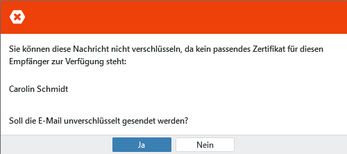 Um E-Mails untereinander verschlüsselt zu versenden, benötigt jeder Empfänger ein entsprechendes Zertifikat. Hat einer der Teilnehmer kein Zertifikat oder befinden sich Empfänger nicht im An...-Feld, werden Sie gefragt, ob Sie die E-Mail unverschlüsselt versenden wollen. Haben sowohl Sie als Absender als auch der Empfänger ein Zertifikat, ist die verschlüsselte Übertragung möglich. Eine Übertragung kann nur durchgeführt werden, wenn die jeweiligen Empfänger im An...-Feld eingetragen sind. Eine verschlüsselte Nachricht an Kontakte zu versenden, welche im Cc... oder Bcc... stehen, funktioniert aufgrund der eingesetzten Verschlüsselungsmethode (OpenSSL) nicht.
