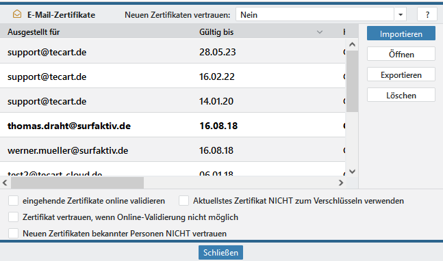In der Liste sehen Sie alle bisher empfangenen Zertifikate. Ihre eigenen Zertifikate, bzw. diese, welche zu gemeinsam verwendeten E-Mail-Konten gehören, werden immer fett dargestellt.