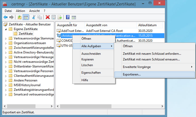 . Darin befindet sich Ihr Zertifikat. Führen Sie einen Rechtsklick auf das Zertifikat aus und wählen Sie Alle Aufgaben > Exportieren.