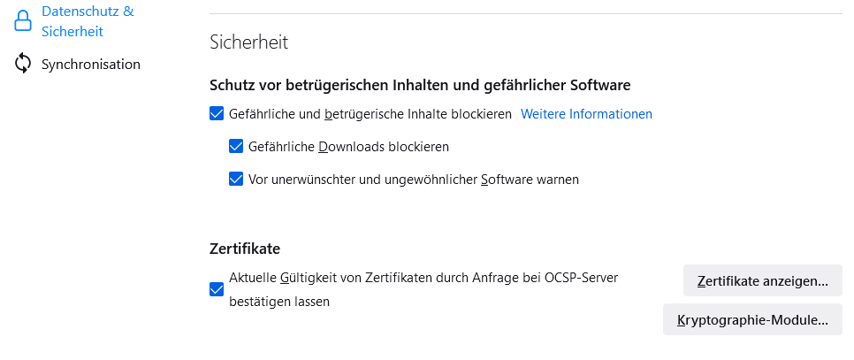 Wechseln Sie im Menü auf Datenschutz und Sicherheit und scrollen zum Abschnitt Sicherheit.